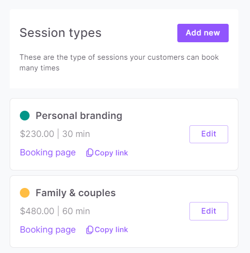 Create full sessions, mini sessions and custom, one-offs to specific clients. No limits are imposed.