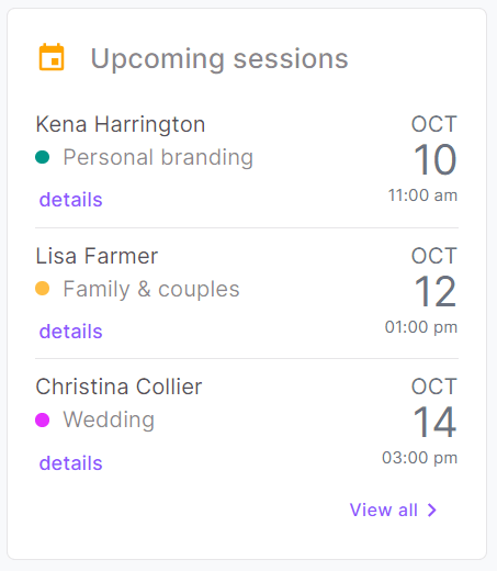 See what's next on your schedule. Easily view session and client details to get prepared to the photoshoot.